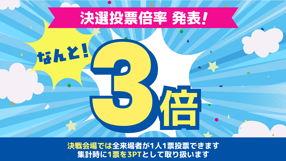 これまで全国から多くの応援と投票をいただきましたが、フィナーレでは会場で投じられた1票を「3PT」としてカウントします。