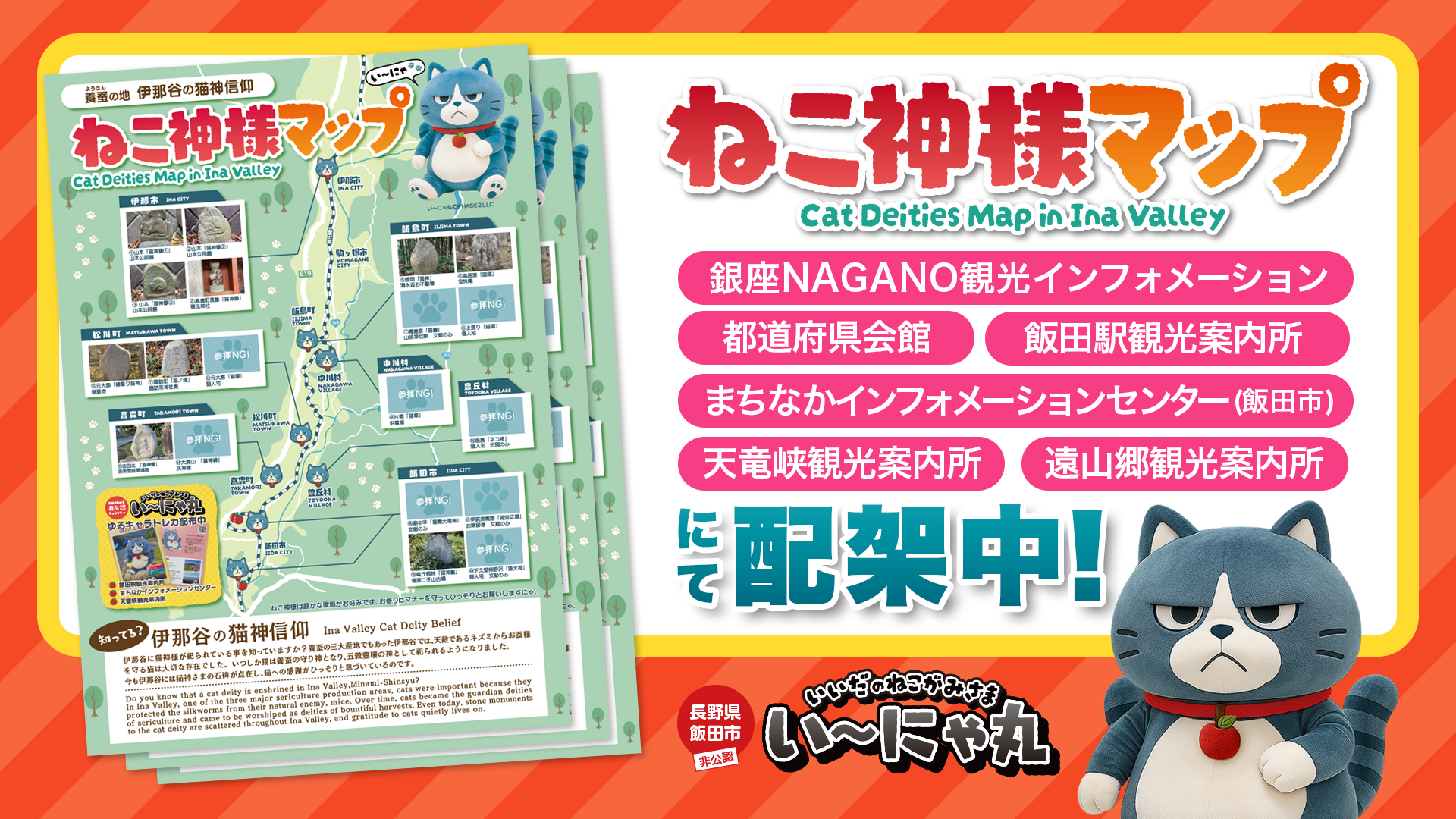 銀座NAGANO観光インフォメーション・都道府県会館・飯田駅観光案内所・まちなかインフォメーションセンター(飯田市)・天竜峡観光案内所・遠山郷観光案内所にて「ねこ神様マップ」配架中❣️