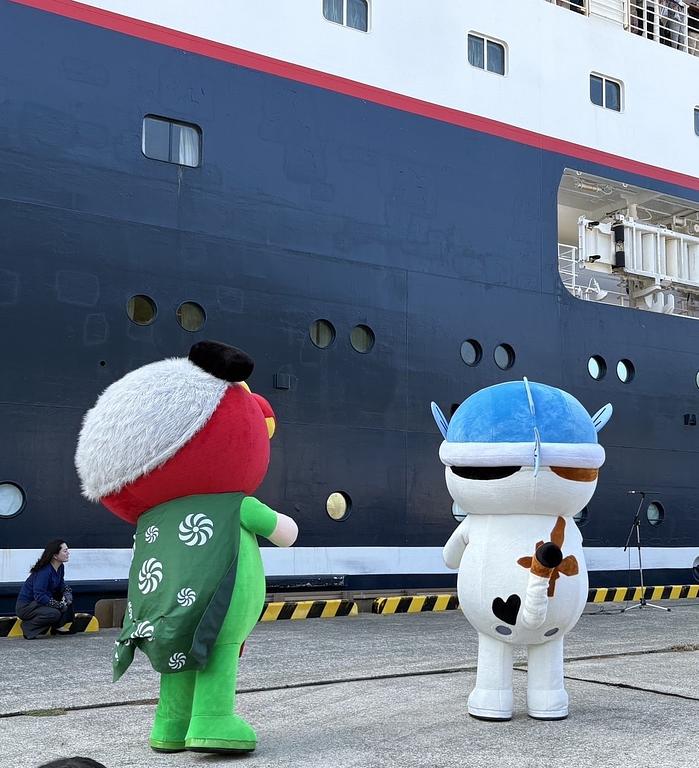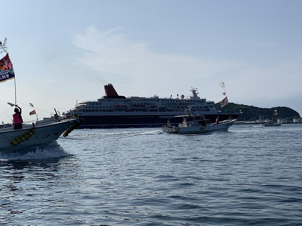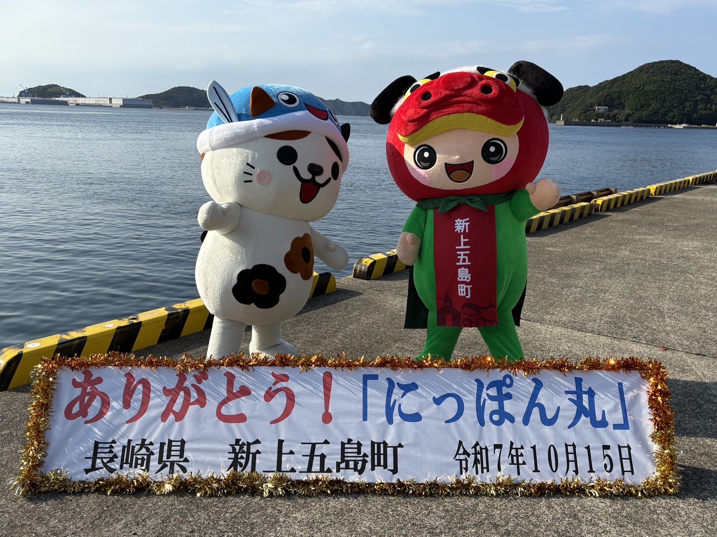 商船三井クルーズのクルーズ船「にっぽん丸」が10月15日に新上五島町に寄港をしました。「にっぽん丸」は2026年5月に引退予定であり、新上五島町には最後の寄港となりました。あミ~ごとみことちゃんもちょっぴり寂しそう...
