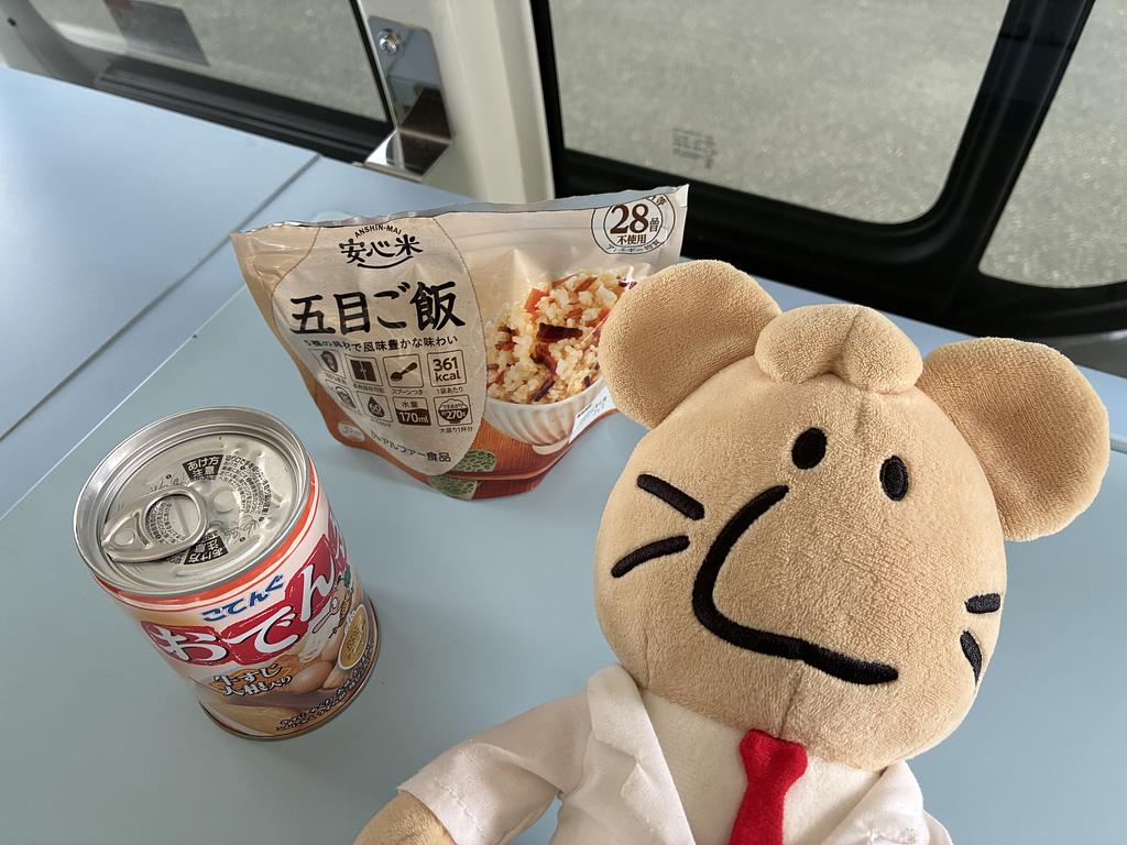 お湯を注ぐだけで食べられるご飯やおでんが振る舞われ、いっぷく先生もいただきました🍚