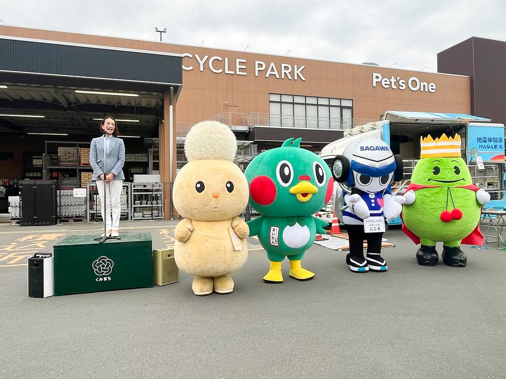 朝霞市のマスコットキャラクター「ぽぽたん」、マイタウンの「まいたん」に続き、佐川急便の「こころ」くん、そして山形県東根市のキャラクター「タントくん」もイベントを盛り上げようと集まったの🐤