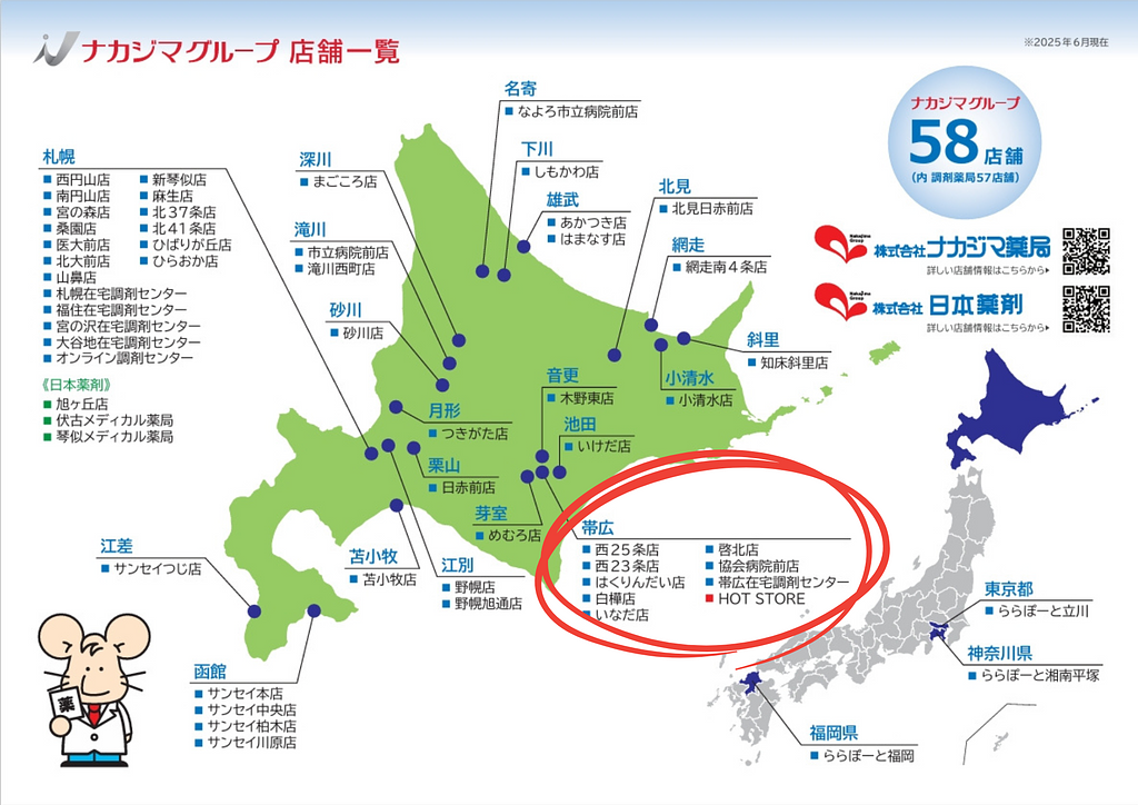 現在、帯広市内にはナカジマ薬局が8店舗、そしてアロマ雑貨店「HOT STORE」も展開しています。