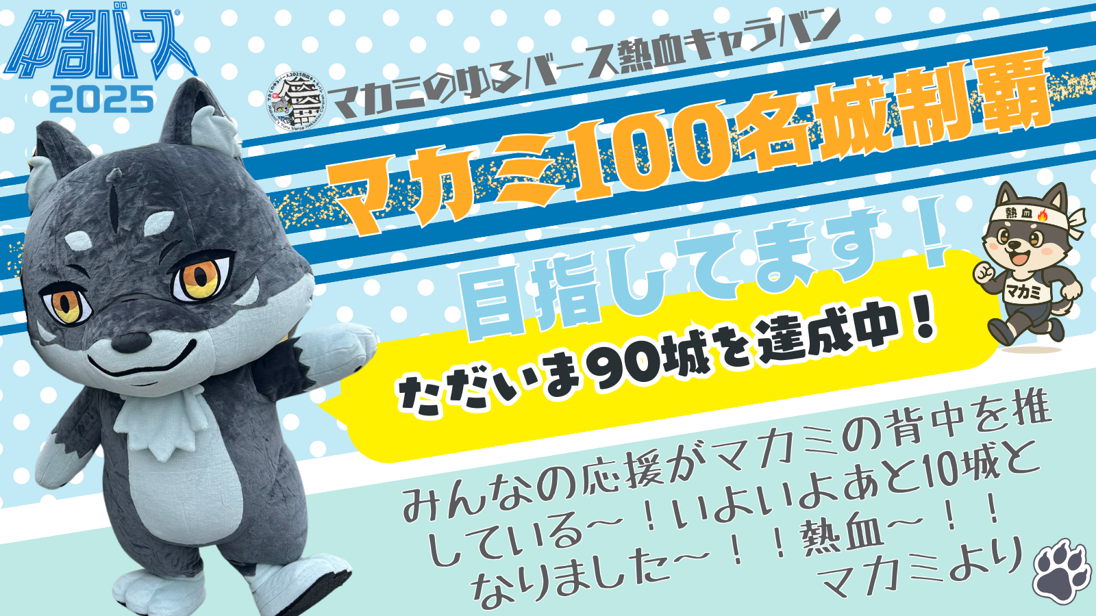 マカミはただいま日本100名城達成に向けて「マカミのゆるバース熱血キャラバン」にチャレンジ中🔥ただ今90城目を達成しました🐺✨よかったら、みんなの応援よろしくお願いします!🔥