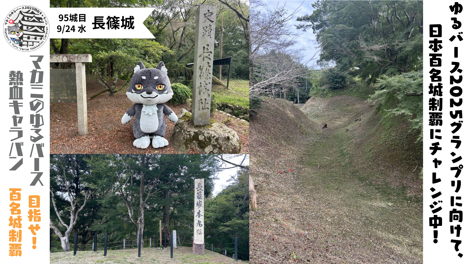9月24日(水)95城目として愛知県新城市にある長篠城を訪れることができました!✨豊川と宇連川が出会う台地の「土の城」だよ~🐺🏯