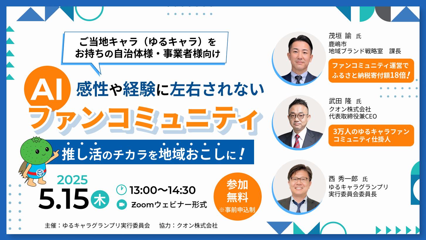 「感性や経験に左右されないAIファンコミュニティ」に関するオンライン特別セミナー、 既に多くの自治体様・事業者様にお申込みを頂いており、誠にありがとうございます。 お申込みは開催前日の14日(水)まで。 オンラインセミナーですので、まだまだ参加申込をお受付しております。 地域おこしの手段として定着しつつある、ご当地マスコットキャラ(ゆるキャラ)の運用。 そのSNS運営やファンづくりなどで直面する課題を解決する手法として、生成AIを活用した ファンコミュニティの可能性を取り上げます。ぜひ一度耳を傾けて頂けましたら幸いです。